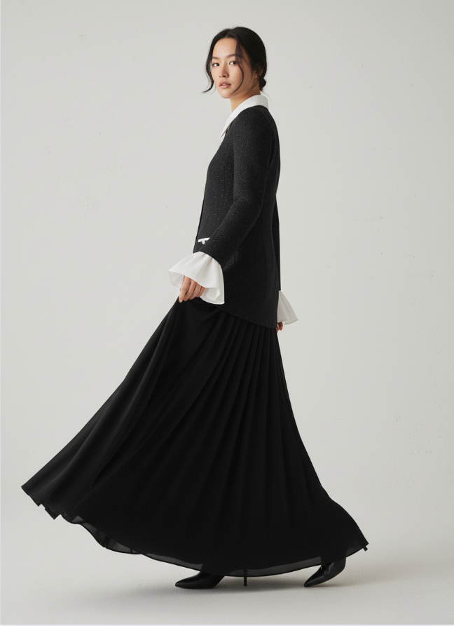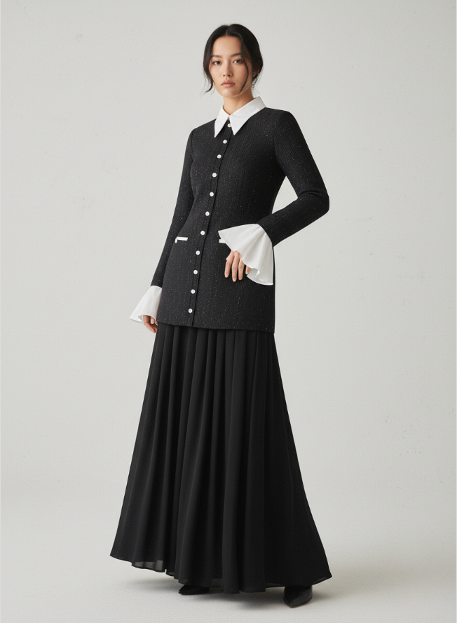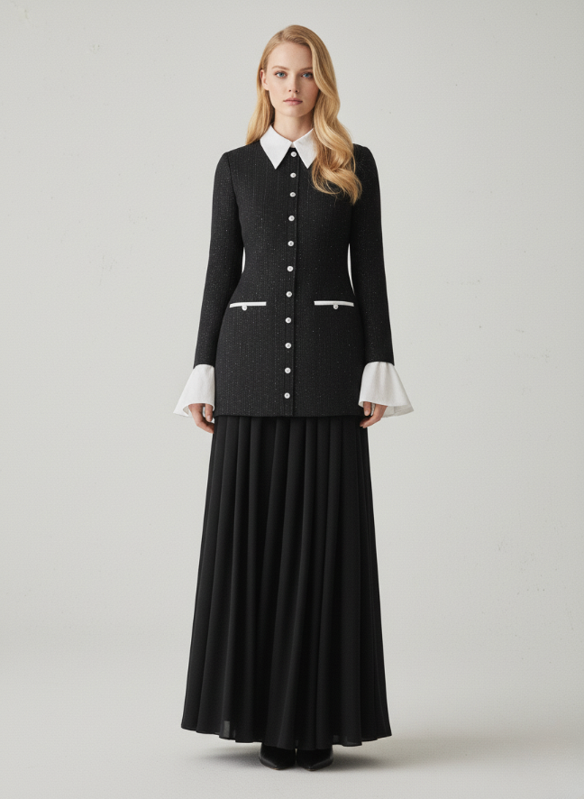 جرأة. أنوثة. أناقة لا تتطلب جهدًا. صورة ظلية مستوحاة من الطراز القديم. أعيد تصميمها بتفاصيل حادة عصرية وأناقة خالدة. مصنوعة مصنوعة من التوييد الأسود المنسوج عالي الجودة والمصمم خصيصاً، يبرز هذا الفستان بتناقضاته الرائعة. مع ياقة بيضاء حادة و أكمام فرنسية مصنوعة من القطن بنسبة 100٪. يوجد صف من الأزرار المصنوعة يدويًا والمغطاة بالقماش على طول الجزء الأمامي. إضافة لمسة من سحر العصر الحديث الكلاسيكي. المظهر أنيق. مع طبقة من الموزلين، مما يضفي خفة وراحة وأناقة. الراحة والحركة. مثالي لـ: شرب الشاي بعد الظهر، أو التنزه في المدينة بأناقة، أو أحدث ظهورًا رائعًا في مناسبتك القادمة.