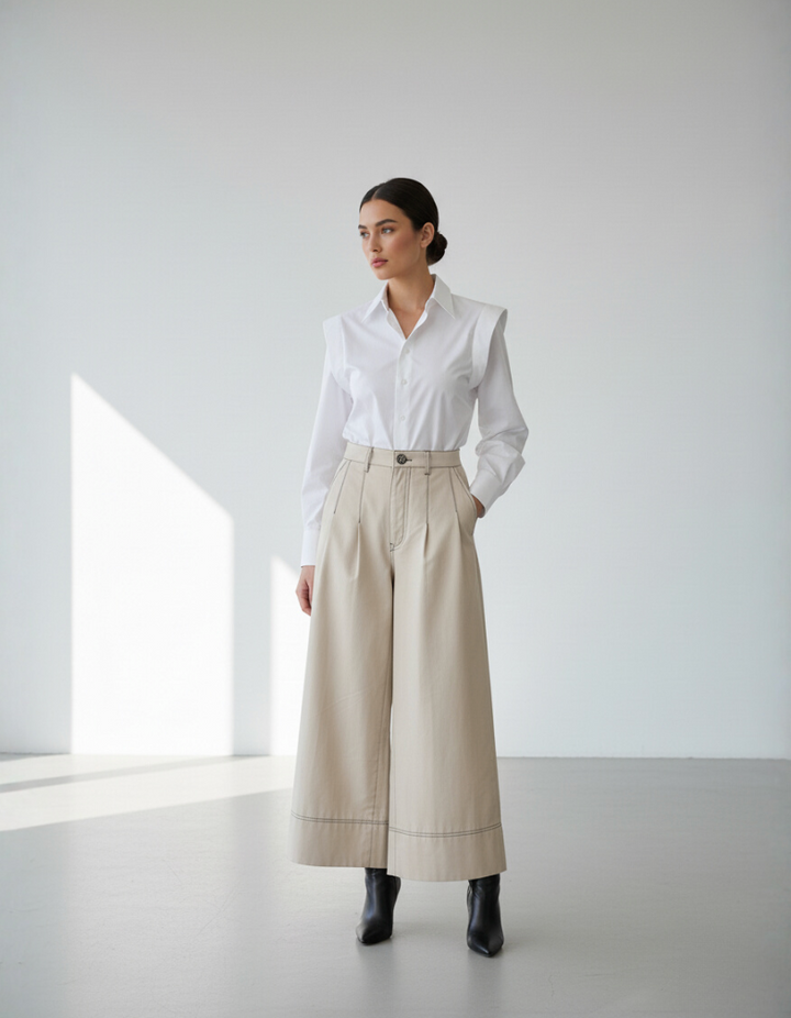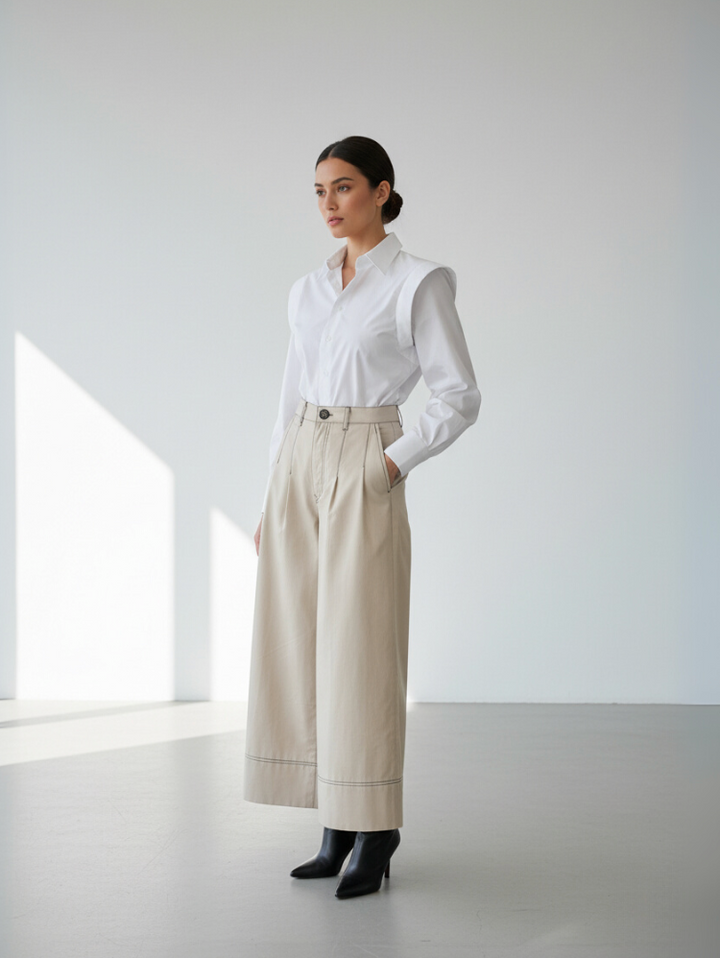 أضفي لمسة أناقة على ملابسك اليومية مع هذه السراويل ذات الخصر العالي والساق العريضة. جينز، مصمم بدقة من نسيج الدنيم البيج المنسق مع تفاصيل أنيقة خياطة سوداء متباينة. تتميز بثنيات أمامية حادة وقصّة أنيقة، تتميز هذه القطعة بتصميمها المعماري الأنيق، وتقدم لمسة عصرية على أناقة لا تتطلب جهدًا. الرقي. سواء تم تنسيقها مع بلوزة وكعبات أو مع ملابس أنيقة تضفي هذه السراويل الجينز المصنوعة من الحياكة والمصممة على شكل حذاء مريح لمسة من الفخامة البسيطة على أي إطلالة. انظر.