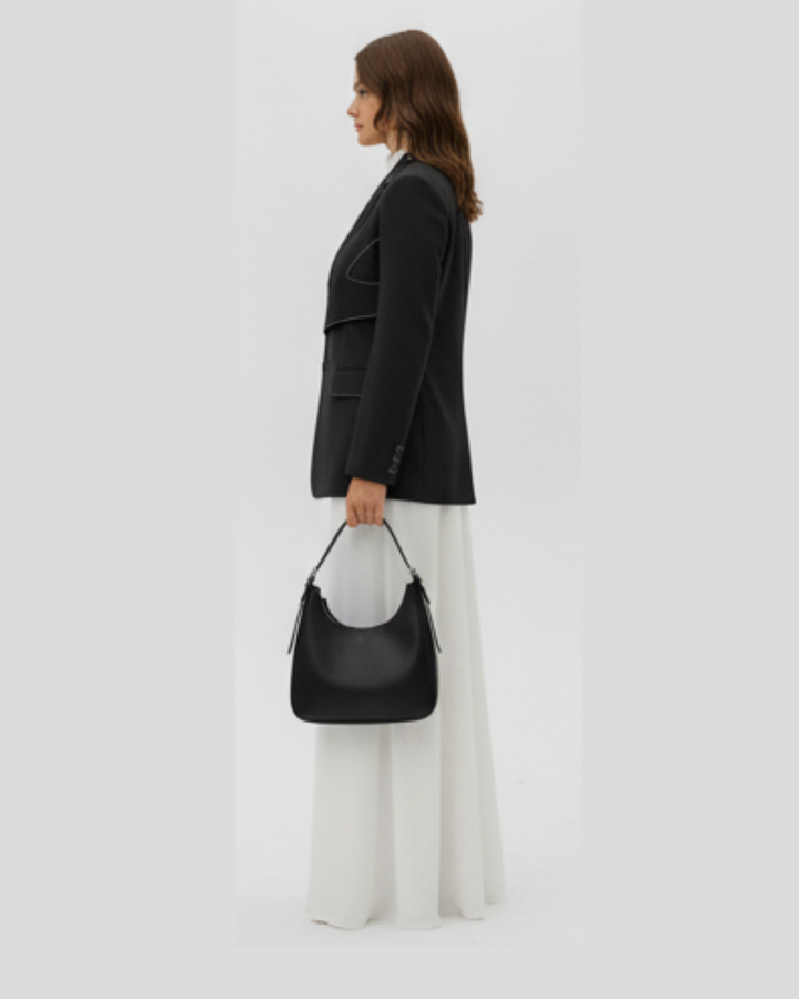 This blazer combines timeless elegance and modernity with its unique asymmetrical detail that subtly reshapes the silhouette. Its structured cut, neat finishes, and contrasting stitching make it a statement piece, perfect for the office or a chic outing.