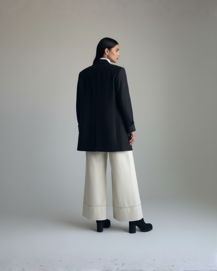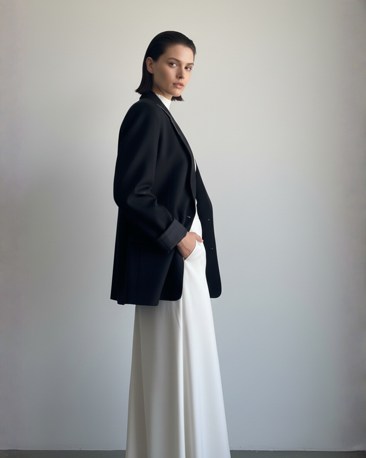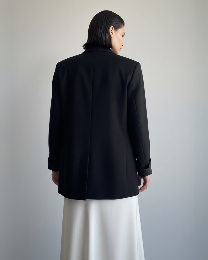 The black blazer that embodies timeless elegance. Its subtly structured oversized cut offers a contemporary silhouette while maintaining a balanced and sophisticated look. An essential piece of the modern wardrobe, it transitions effortlessly from day to evening, lending an understated yet powerful touch to any occasion.